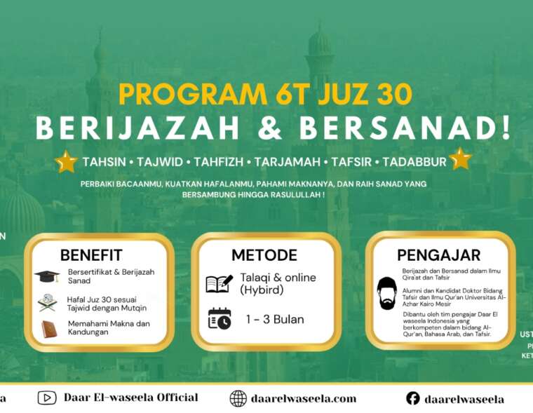 Daar Elwaseela Indonesia di bawah asuhan Ustadz Imam Almarghany, Lc., M.A. kembali membuka Program 6T Juz 30 Berijazah & Bersanad — sebuah program intensif untuk memperbaiki bacaan, memperkuat hafalan, memahami makna, hingga mendapatkan sanad bacaan Al-Qur’an yang bersambung hingga Rasulullah ﷺ.